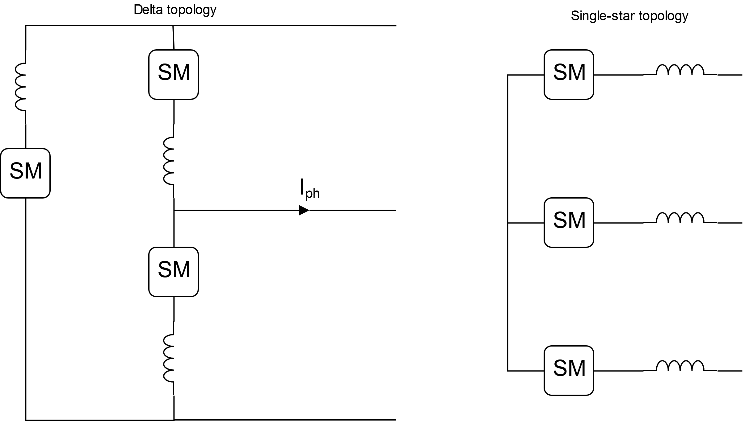+På liknande sätt så vore det riktigt trevligt att få en lite simplare bild över topologierna och vilka strömmar det är som menas. Rita in line-to-line voltage, phase current osv i de simla figurerna. Något i den här stilen skulle vara väldigt hjälpsamt för mig att förstå:
